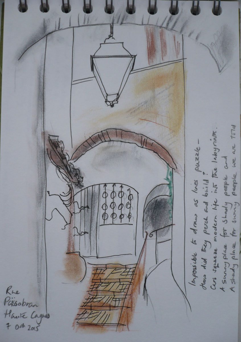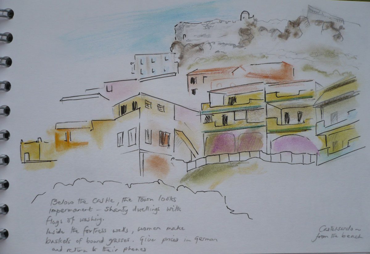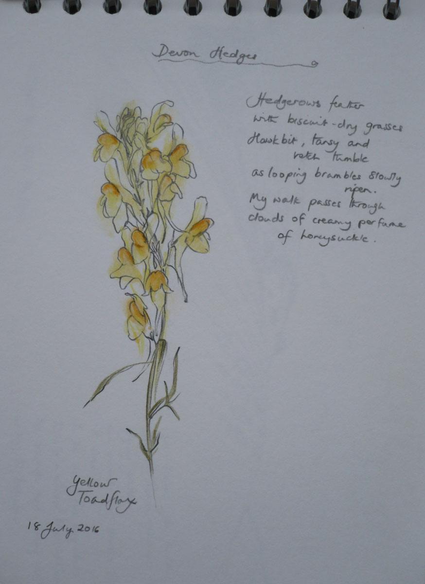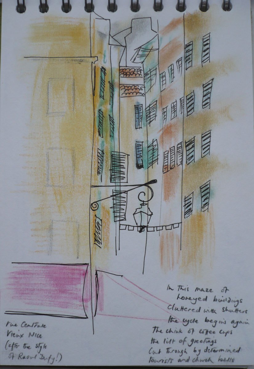 I know my sketch book input is irregular and definitely falls into the category of ‘could do better’ but since 2012 I have been drawing sometimes on walks and always on holiday and, integral to what I have drawn, is the poem that is forming as I sit and look. I hardly ever change the words and they are written in one take immediately once I stop, conveying as much as the image to remind me of the place that made me want to draw it. As I tend not to reach for paints and don’t want much kit with me, I use water colour crayons and it is the good old lick of a finger and smudge that does the rest!